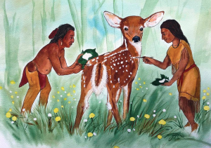 “The first one offers the child a knife, the second one offers them a bunch of poisonous herbs, the third offers a bunch of herbs yielding good medicine. If the child accepts the knife, they are certain to become a bad person and he may even kill their friends. If they accept the poisonous herbs, they will never be able to cure or help their people. But, if they accept the good herbs, they are destined to become a great doctor and an important and influential person of their tribe and win the confidence of their people. When they accept the good herbs, the three old spirits will tell them the secrets of making medicines from herbs, roots and barks at certain trees, and of treating and curing various fevers, pains and other sickness.”